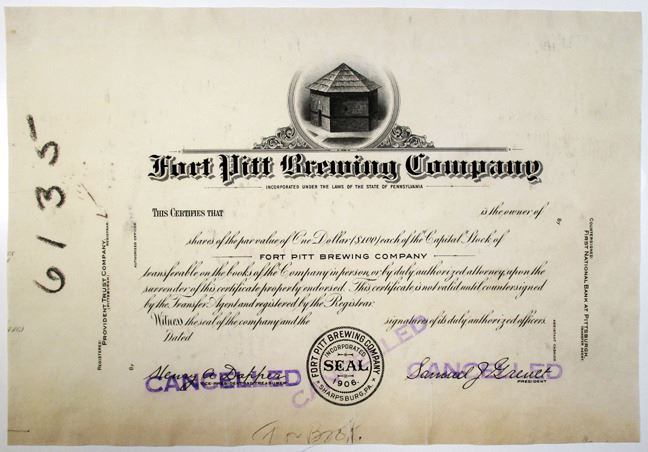 Pennsylvania, ND (1930s). Odd Shares Progress Proof Capital Stock Certificate, Black text on off-white paper, Fort building depicted at top center. Purple cancelled stamps at bottom, "6135" written at left in black, writing in pencil at bottom center. Fort Pitt Brewing Company was a major brewery in Pittsburgh, Pennsylvania, from 1906-1957, which brewed Fort Pitt Beer and other regional brands.