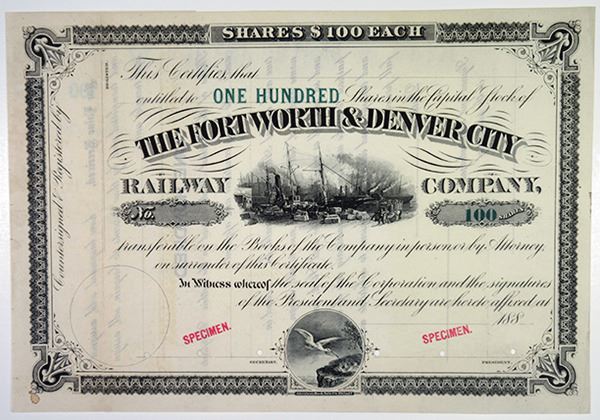 Texas, 1880-1889. 100 Shares, Specimen Stock Certificate, Black text with black border, Allegorical scene of dockyard at top, pelican feeding chicks at bottom. Pink Specimen overprints, VF condition with a small stain near bottom left corner, ABNC Philadelphia. Only known as a specimen in Cox.