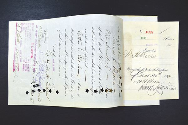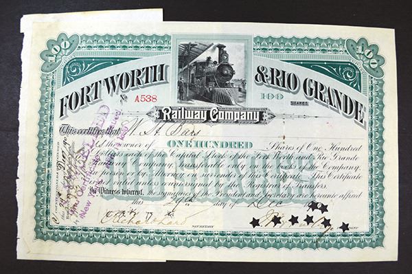 Texas. 100 Shrs Stock Certificate. Issued. Cancelled. Star POCs at signatures. Paper Tone, notations on back. Attached to stock book counterfoil at end. VF.