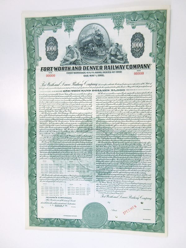 Texas. $1,000 Specimen 4 3/8% 1st Mortgage Coupon Bond, Black print on green border and under tint, Locomotive in circular frame at top flanked by allegorical figures, Specimen overprints and POC's, VF-XF condition, ABNC.