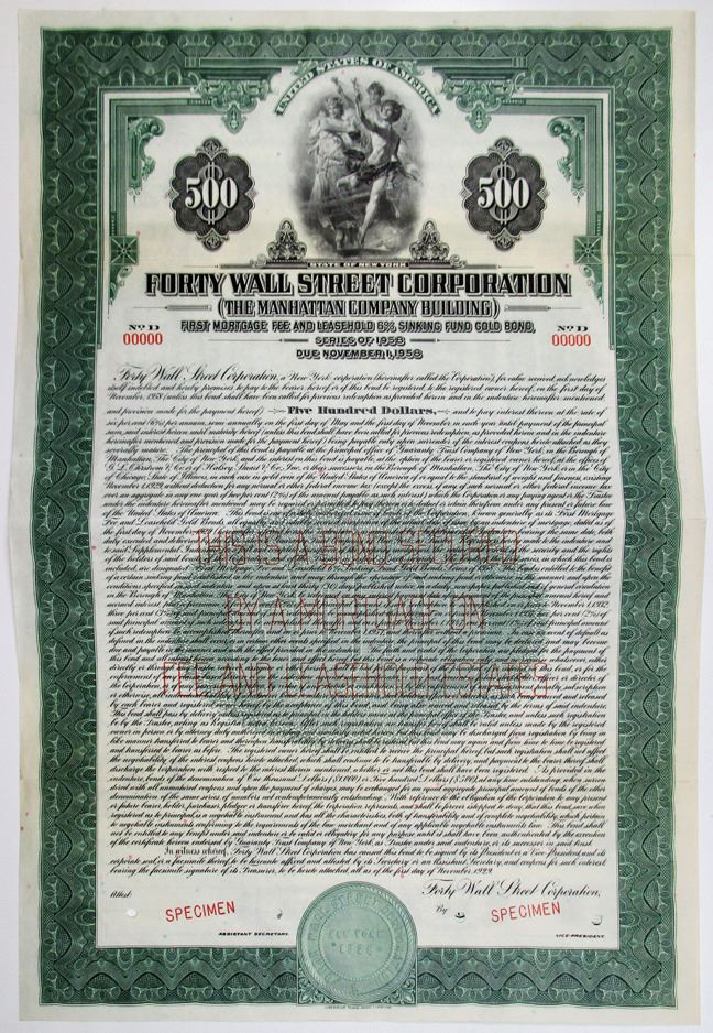 New York, 1929. $500 Specimen 6% First Mortgage Fee and Leasehold Sinking Fund Gold Coupon Bond, Black text with green border and undertint, Trio of allegorical figures in sky at top center. Red specimen overprints, 00000 serial numbers, and POCs. VF condition, ABNC. 40 Wall Street, also known as the Trump Building, is a 927-foot-tall (283 m) neo-Gothic skyscraper on Wall Street between Nassau and William streets in the Financial District of Manhattan in New York City. Erected in 1929Ð1930 as the headquarters of the Manhattan Company, the building was originally known as the Bank of Manhattan Trust Building, and also as the Manhattan Company Building, until its founding tenant merged to form the Chase Manhattan Bank. It was designed by H. Craig Severance with Yasuo Matsui and Shreve & Lamb.