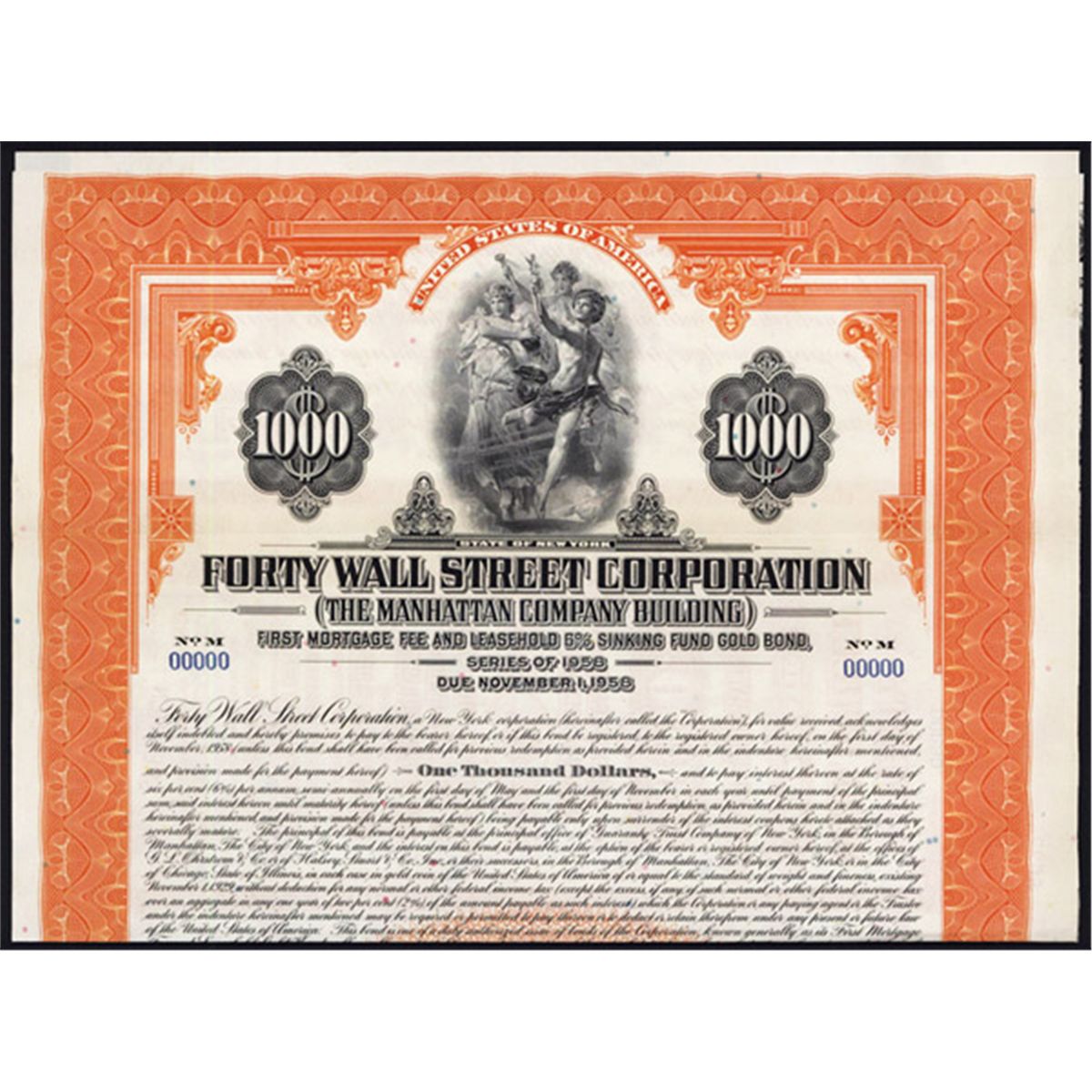 New York, NY, 1929, $1000, 1st Mortgage Fee and leasehold 6% Sinking Fund Gold Bond, Series of 1958, Black on orange, Mercury with 2 other allegorical women, Specimen overprints, Coupons attached, VF condition, 40 Wall Street is a 70-story skyscraper located in New York City. Originally known as the Bank of Manhattan Trust building and also known as Manhattan Company Building. The building, was completed in 1930 after only 11 months of construction. The architects of 40 Wall Street changed their originally announced height of 840 feet or 68 stories, to 927 feet or 71 stories, making their building, upon completion in May 1930, the tallest in the world. However, this triumph turned out to be exceptionally short-lived to be broken by the Empire State Building completed in 1931. On May 20, 1946, a United States Army Air Forces C-45 Beechcraft airplane crashed into the north side of the building. 40 Wall Street was bought by Donald Trump and later renamed The Trump Building.