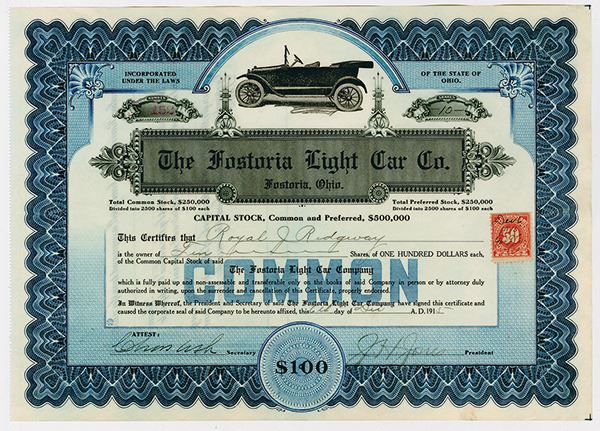 Ohio. 10 Shares Common Capital Stock Issued and Uncancelled Certificate, Black print on large blue border and under tint, Old automobile at top, VF-XF condition.