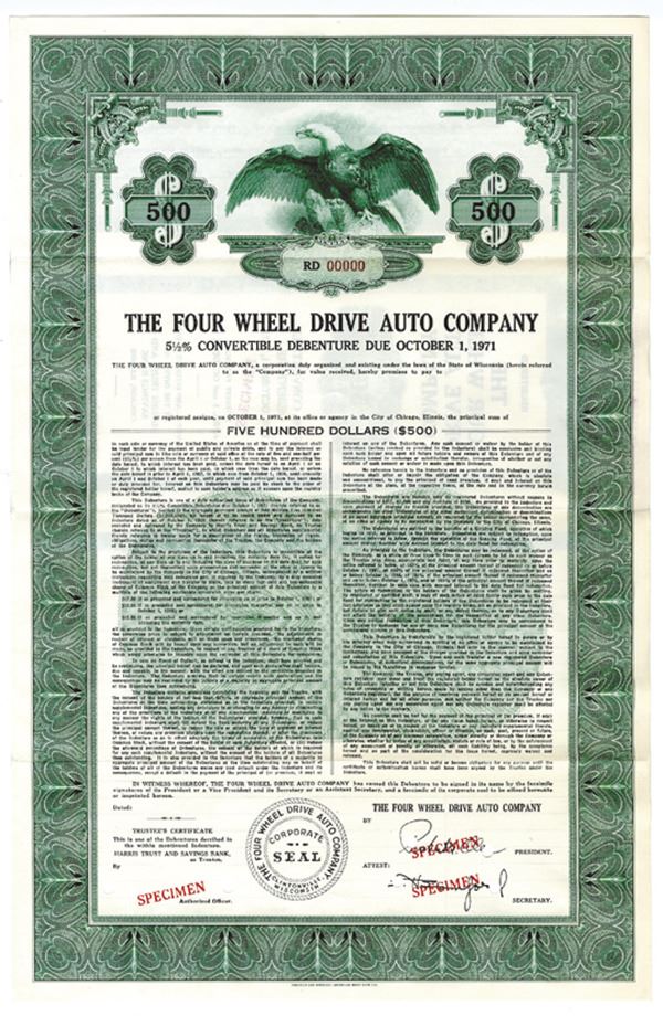 Wisconsin. $500 5 1/2% Convertible Debenture Coupon Bond, Black print on green border and under tint, Bald Eagle at top, Specimen overprints and POC's, VF-XF condition, FL-ABNC.