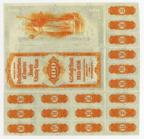 $100 Fourth Liberty Loan 4.25 % Gold Bond of 1933-1938 Issue October 24, 1918. SN.G01955527.Beautiful example of this 4th Liberty Loan Bond series. (18) Coupons remain on this Choice XF example. Fully embossed. Golden - Orange inks adorn the reverse.
