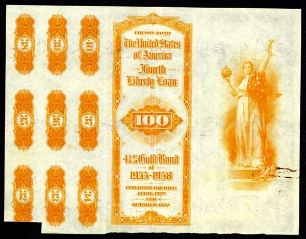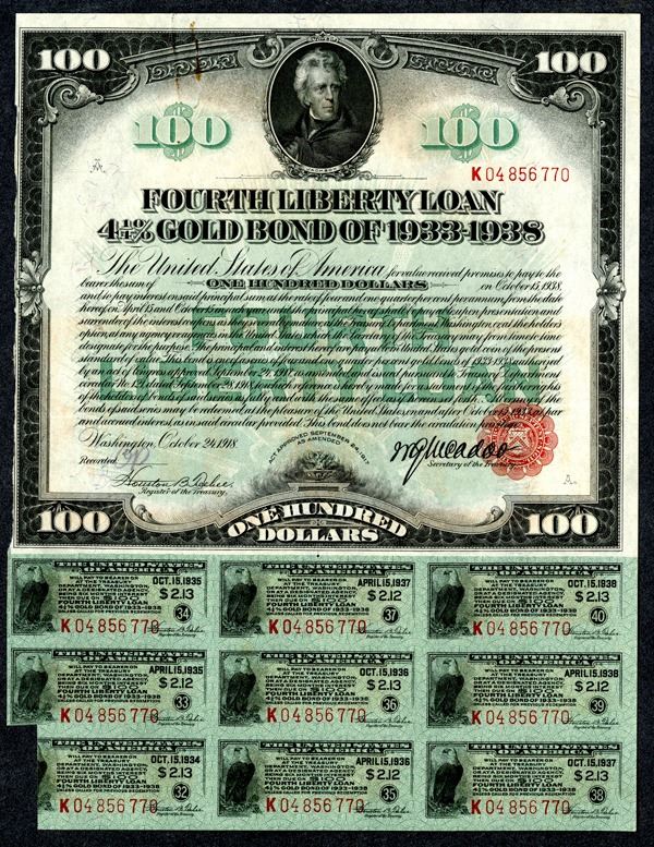 $100, Jackson on top, a Fourth Liberty Loan “Permanent” or Long Bond has a mint green under-print with a vibrant red treasury seal. There are coupons 32-40 attached. The reverse has a golden orange rendition of “Justice” draped with the American flag on the bond. Appears VF bu there is an area of rust burn from an old paper clip to the left of Jackson's portrait with a very thin area of paper loss due to this, still rare and attractive bond.