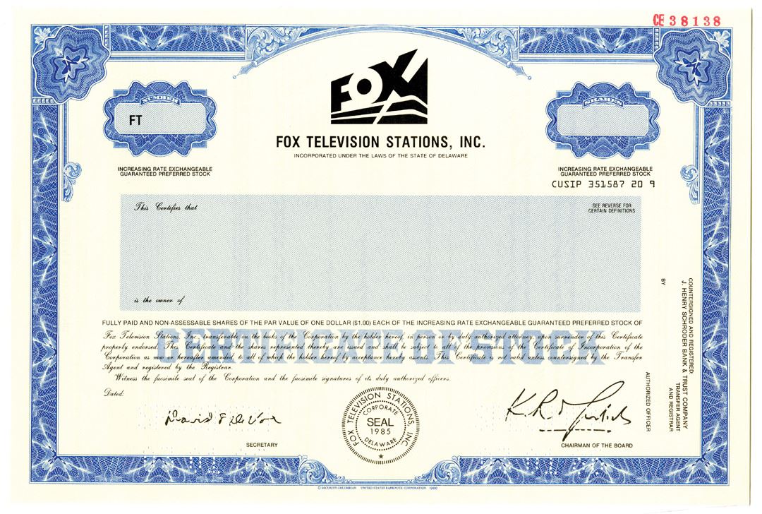 Delaware, 1986. Odd Shares Specimen Increasing Rate Exchangeable Guaranteed Preferred Stock Certificate, Black text with blue border and underprint, Fox logo at top center. Specimen POCs, VF condition, SC-USBN.