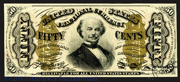Fr. 1326, 50 cent; Third Issue Spinner PMG graded Choice About New 58PPQ. Great margins and a bit on handling are seen on this scarcer on face red back Spinner. This note has gem margins and we suspect that it will receive bids well in advance of what a typical AU note commands.