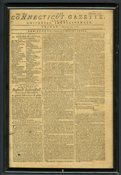Connecticut, 1783, 'Connecticut Gazette and the Universal Intelligencer' in black frame, Front section is more national in scope covering Congressional matters with the reverse covering local issues including the notice of a runaway slave, Print on front and back, VF condition, Printed by Timothy Green.