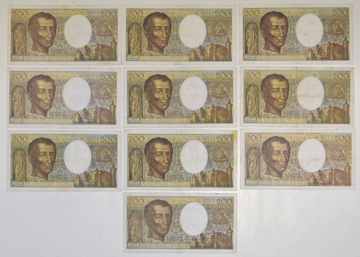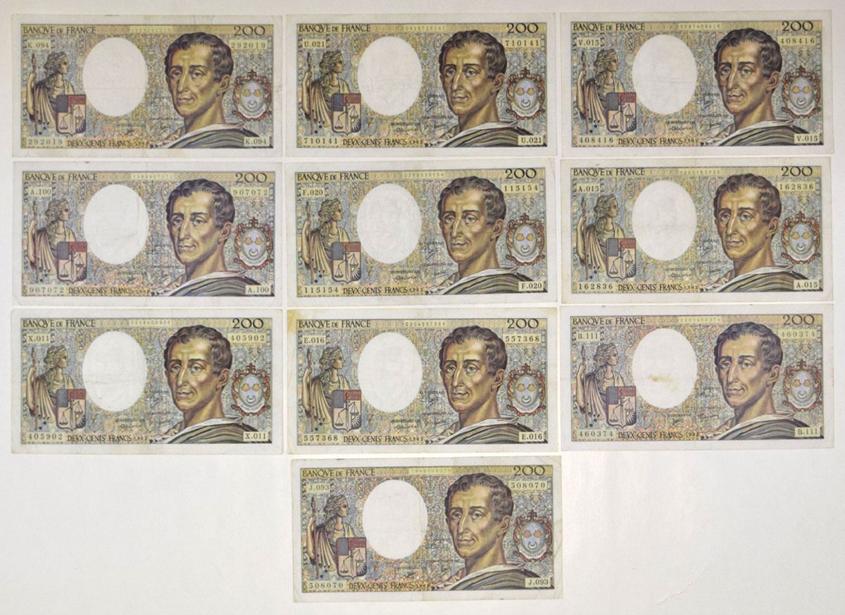 France, 1983-92. Lot of 10 notes, All are 200 Francs, P-155a (6), P-155d (4), & P-155e, Issued Banknotes, Blue-green with yellow and m/c printing, Figure with staff at left and Charles Baron de Montesquieu at right, Back shows Montesquieu at left and Castle of Labrede at right, Notes range from Fine to VF+ condition. (10). Sold "AS IS" no returns accepted.