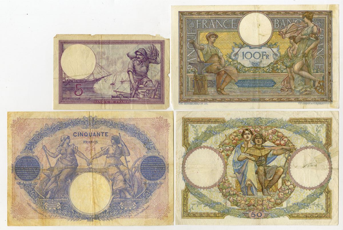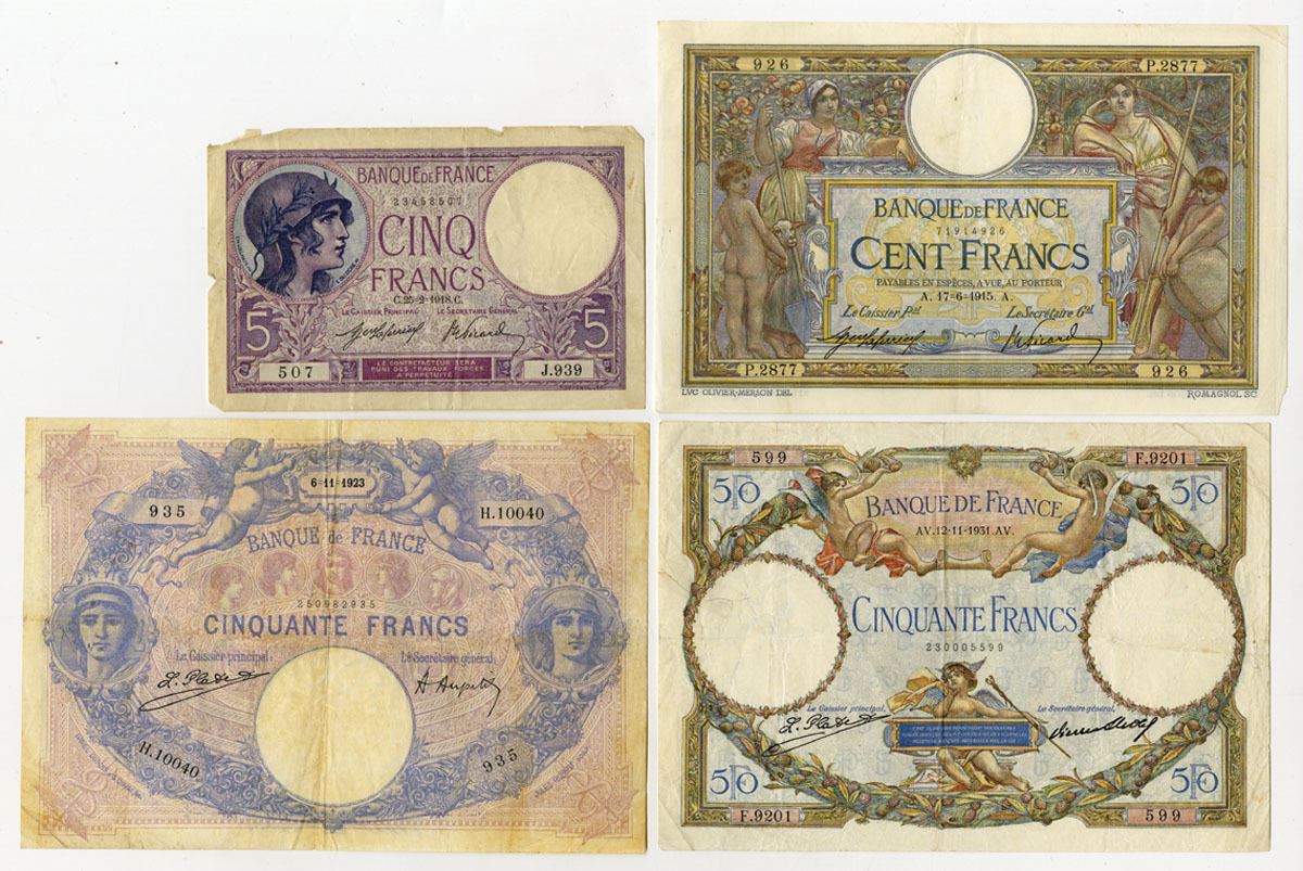 France…., 1915 to 1931. Lot of 4 Issued Banknotes, Includes: 50 Francs, P-64g, 1923; 100 Francs, P-71a, 1915; 5 Francs, P-72a, 1918; 50 Francs, P-80a, 1931. Notes range from Fine to VF+ condition. (4). Sold "AS IS" no returns accepted.