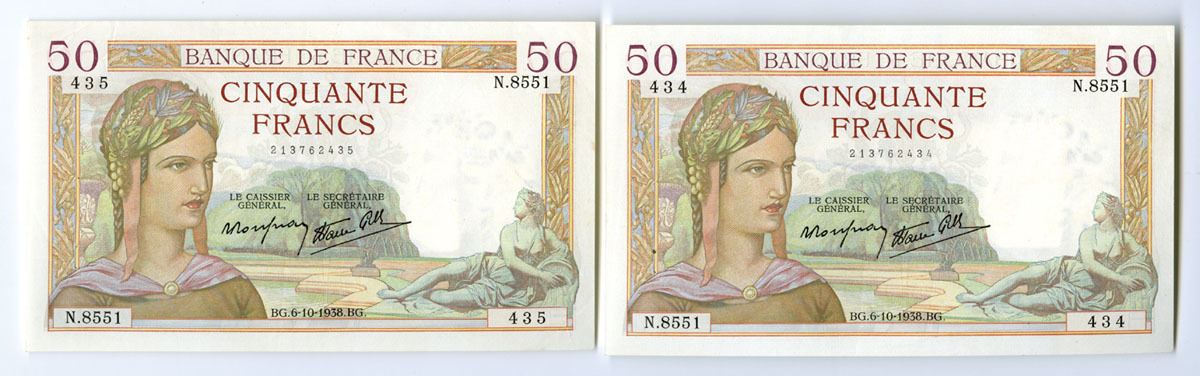 France....., 1938. 50 Francs, P-85b (2), Sequential Issued Pair of Banknotes, M/c printing with Ceres and Park of Versailles at left with reclining figure/statue at right, Back is m/c with Mercury at right with caduceus, S/Ns N.8551 434 & N.8551 435, One is in Choice XF with 2 bent corners and a rough area, and the second is in XF to AU condition. (2). Sold "AS IS" no returns accepted.