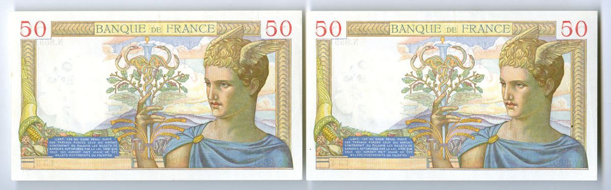 France....., 1938. 50 Francs, P-85b (2), Sequential Issued Pair of Banknotes, M/c printing with Ceres and Park of Versailles at left with reclining figure/statue at right, Back is m/c with Mercury at right with caduceus, S/Ns N.8551 434 & N.8551 435, One is in Choice XF with 2 bent corners and a rough area, and the second is in XF to AU condition. (2). Sold "AS IS" no returns accepted.