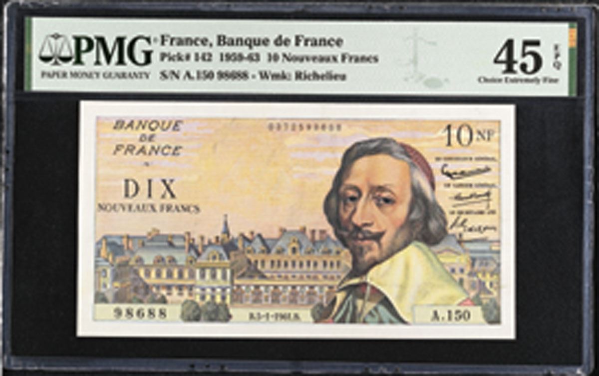 France, 1961. 10 Nouveaux Francs, P-142, Issued Banknote, Black and m/c printing with Palais Royal across bottom and Arman du Plessis (Cardinal Richelieu) at right, Back is m/c with Town Gate of Richelieu at center and Cardinal at left, S/N A.150 98688, PMG graded Choice Extremely Fine 45 EPQ.