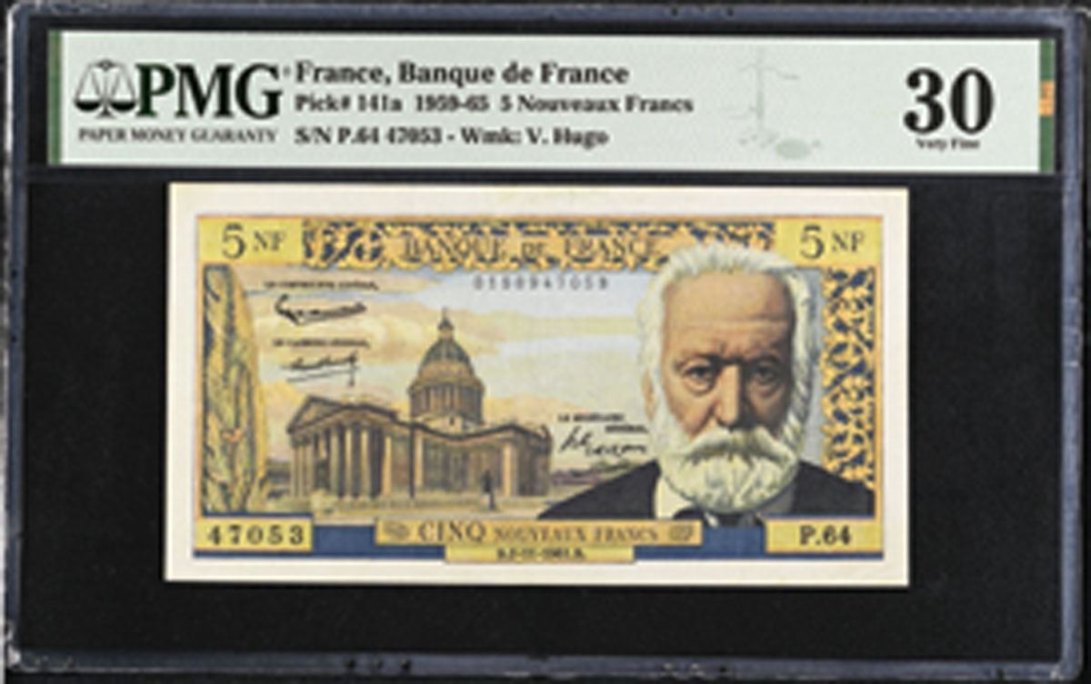 France, 1961. 5 Nouveaux Francs, P-141a, Issued Banknote, Blue with orange and m/c printing, Pantheon in Paris at left and Victor Hugo at right, Watermark of Victor Hugo, S/N P.64 47053, PMG graded Very Fine 30.
