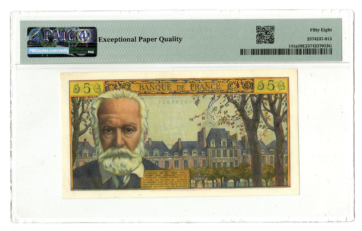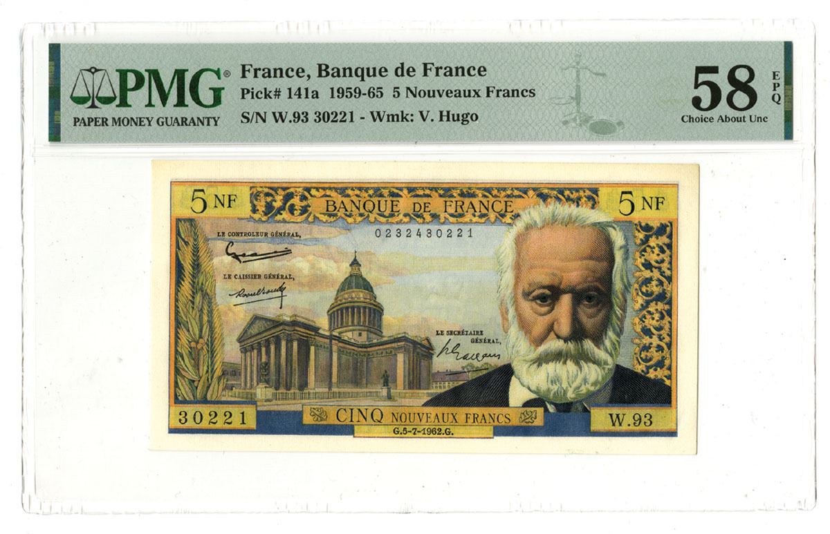 France, 1962. 5 Nouveaux Francs, P-141a, Issued Banknote, Blue with orange and m/c printing, Pantheon in Paris at left and Victor Hugo at right, Watermark of Victor Hugo, S/N W.93 30221, PMG graded Choice About Uncirculated 58 EPQ.