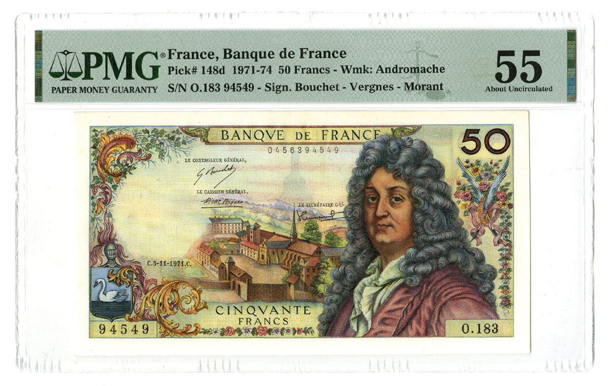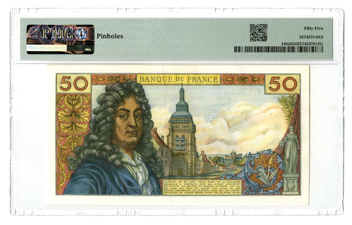 France, 1971. 50 Francs, P-148d, Issued Banknote, M/C printing with Port Royal des Champs Abbey at center and Jean Racine at right, Back has Racine again and view of La Ferte-Milon, S/N O.183 94549, PMG graded About Uncirculated 55 with comment "Pinholes."
