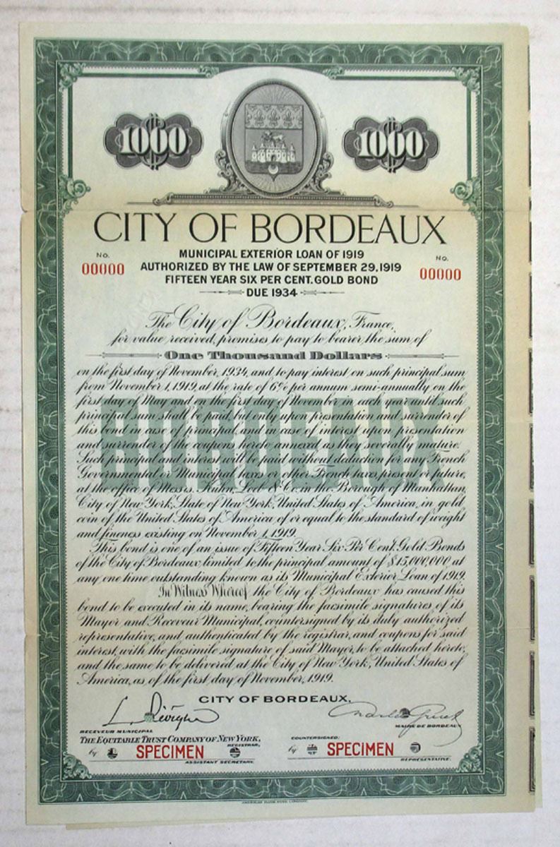 Bordeaux, France, 1919, $1000 (U.S.), Specimen Bond, Municipal Exterior Loan of 1919 Authorized by the Law of September 29, 1919, 15 Year, 6% Gold bond, Coupons attached, green border and underprint, Arms of Bordeaux on top in oval, Specimen overprints and Poc's, VF condition with splitting along fold lines, attractive and rare bond from this historic wine making region. ABNC.