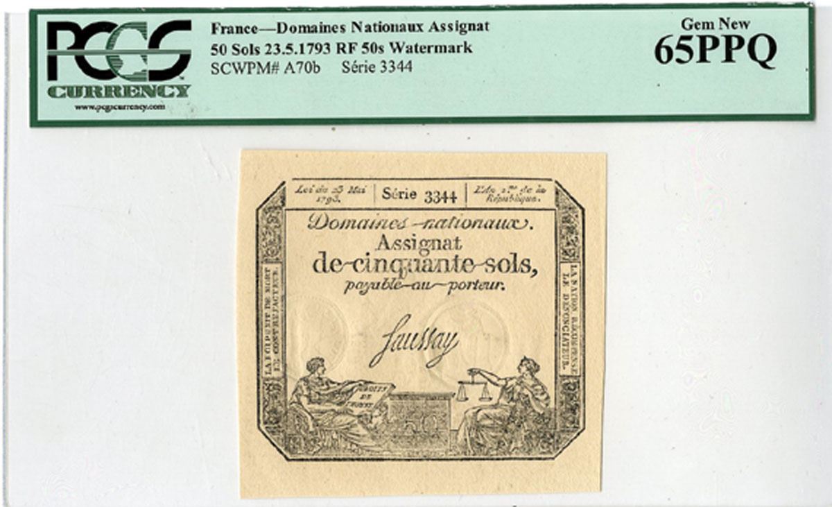 France, 1793. 50 Sols, P-A70b, Issued Banknote, Black printing with allegorical women at lower left and right, Serie 3344, PCGS graded 65 PPQ Gem New.