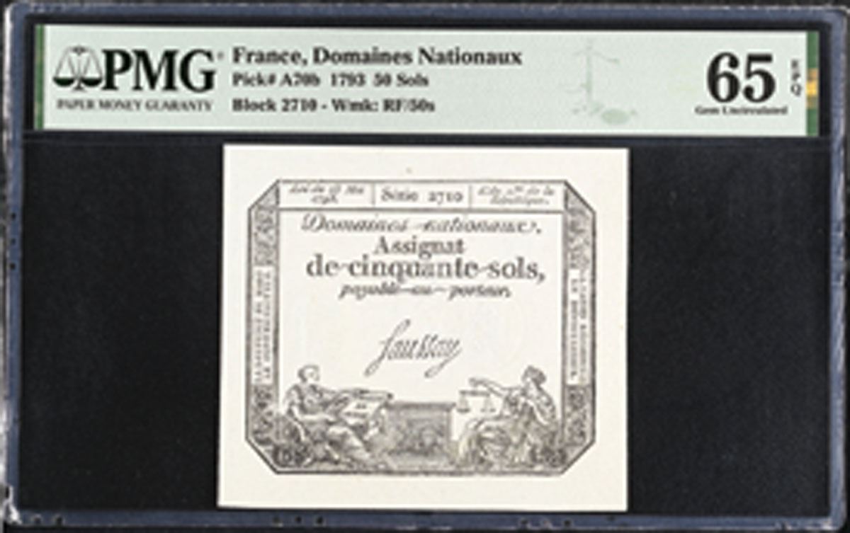 France, 1793. 50 Sols, P-A70b, Issued Banknote, Black printing with allegorical women at lower left and right, Block 2710, PMG graded Gem Uncirculated 65 EPQ.