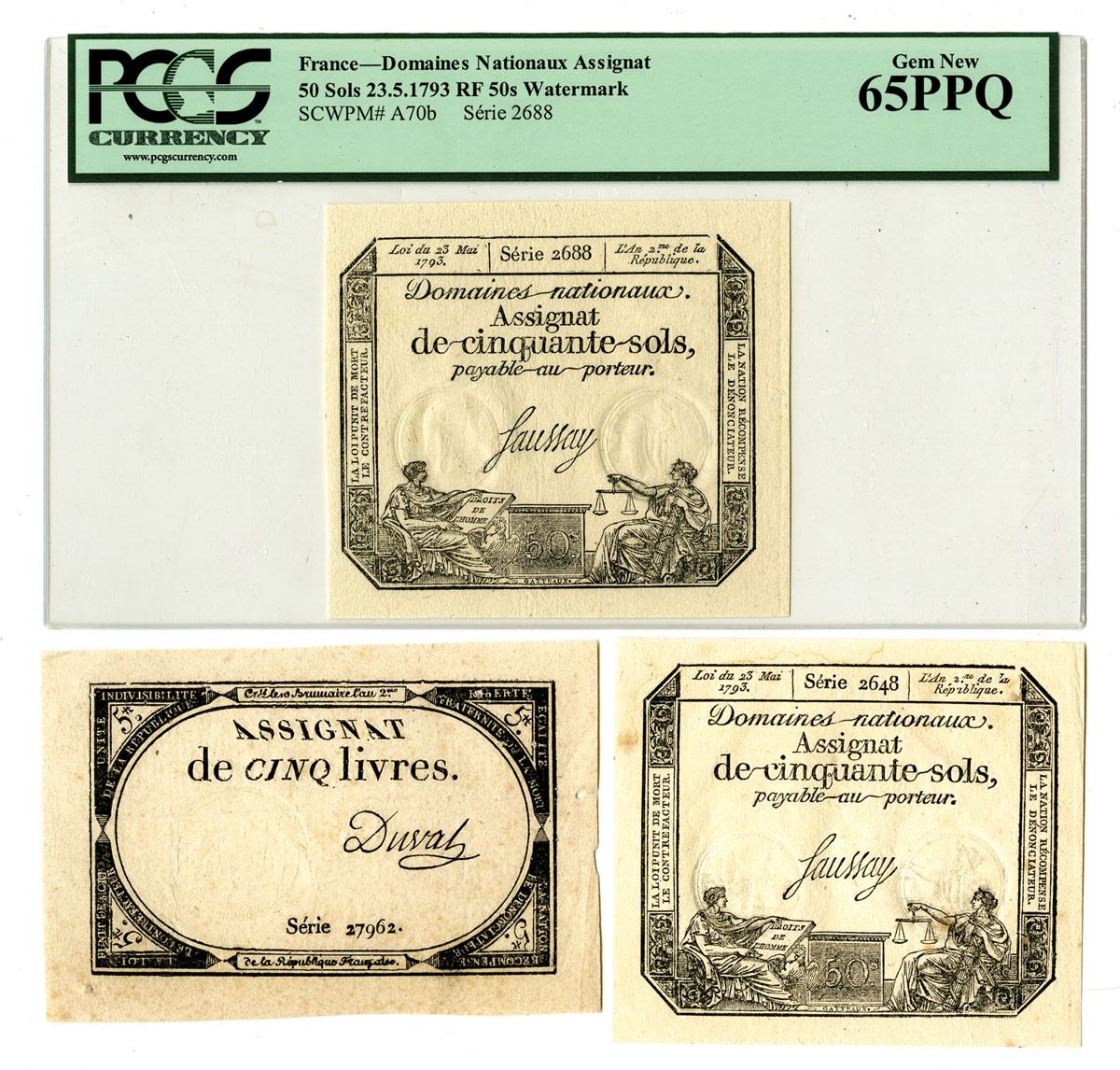 France, 1793. Lot of 3 Issued Banknotes, Includes: 50 Sols, P-A70b (2),Serie 2648 and 2688, Black print with allegorical women at lower left and right, 1 note is in VF to VF+ condition and other is PCGS graded Gem New 65 PPQ; 5 Livres, P-A76, Black print, Series 27962, VF to XF condition. (3). Sold "AS IS" no returns accepted.