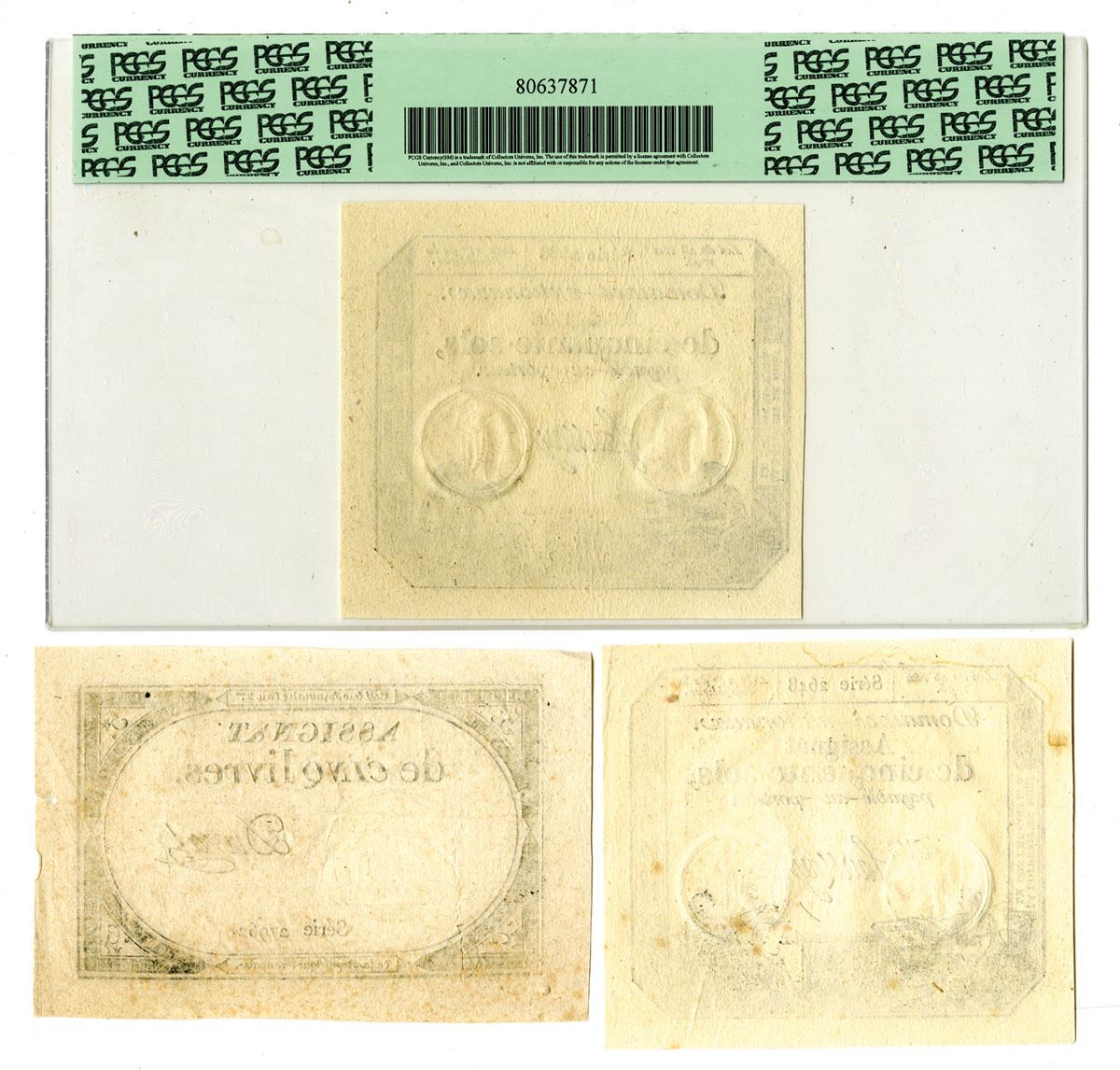 France, 1793. Lot of 3 Issued Banknotes, Includes: 50 Sols, P-A70b (2),Serie 2648 and 2688, Black print with allegorical women at lower left and right, 1 note is in VF to VF+ condition and other is PCGS graded Gem New 65 PPQ; 5 Livres, P-A76, Black print, Series 27962, VF to XF condition. (3). Sold "AS IS" no returns accepted.