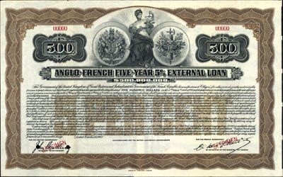 1915. $500. Specimen Five-Year 5%Bond. Brown border. Vignette of allegorical woman "Justice" holding scales with arms of The United Kingdom of Great Britain and Arms of France flanking her. Facsimile signature of "John Bradbury" as Secretary of the Treasury for Great Britain. Coupons attached. Red specimen overprints, POC's and "00000" serial numbers. XF condition. Extremely rare and attractive bond. ABNC.