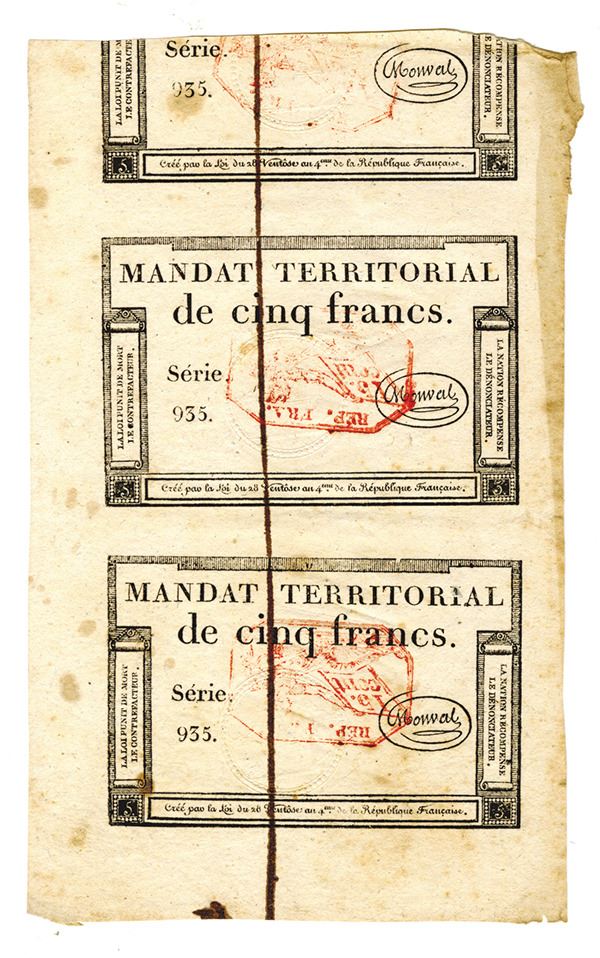 France. Uncut pair of notes, 5 Francs, P-87c, Issued uncut pair, Red overprint, also includes 1/2 of an additional note uncut on top. VF. Scarce note.