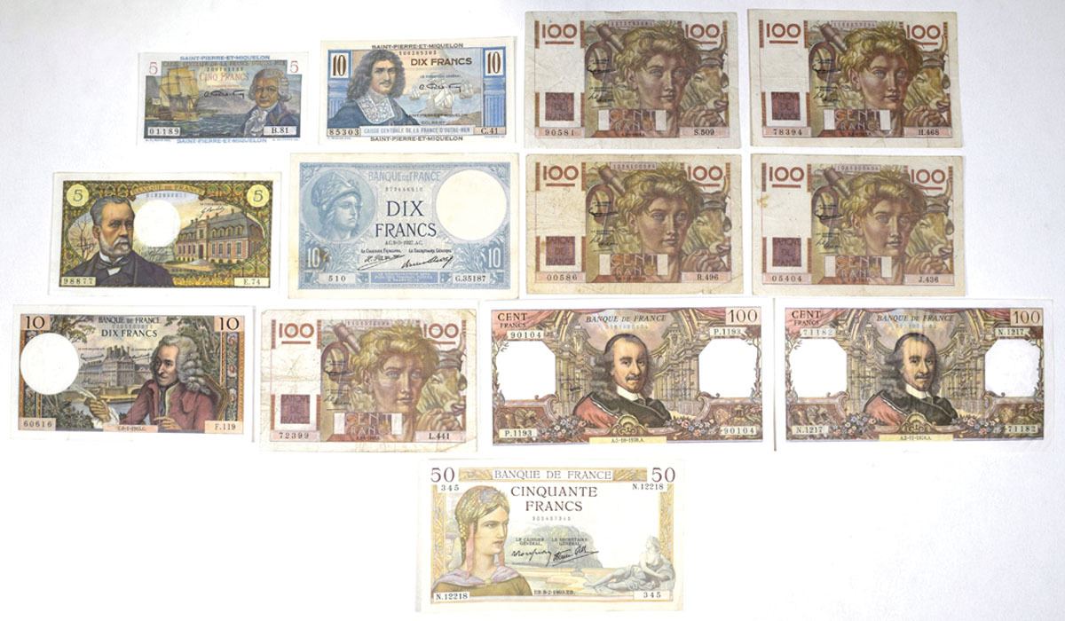 France......, & St. Pierre et Miquelon, ND (1950-60) to 1978. Lot of 13 Issued Banknotes, Includes: Saint Pierre et Miquelon - French Administration, ND (1950-60), 5 Francs, P-22; ND (1950-60), 10 Francs, P-23; Banque de France, 1927, 10 Francs, P-73d; 1940, 50 Francs, P-85b; 1952-53, 100 Francs, P-128d (4) and P-128e; 1968, 5 Francs, P-146b; 1965, 10 Francs, P-147a; 1978, 100 Francs, P-149f (2). Notes range from VF to AU condition. (13). Sold "AS IS" no returns accepted.