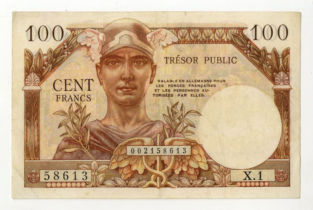 France…..., ND (1947). 100 Francs, P-M9, Issued Banknote, Brown and m/c printing with Mercury at center, Back is brown and m/c with reclining woman at center, S/N X.1 58613, VF to Choice VF condition.
