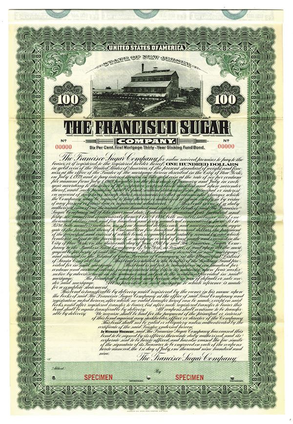 New Jersey. $100 Specimen 6% 1st Mortgage Sinking Fund Coupon Bond, Black print on ornate green border and under tint, Image of processing plant at top, Specimen overprints, POC's, VF-XF condition, FLBNC.
