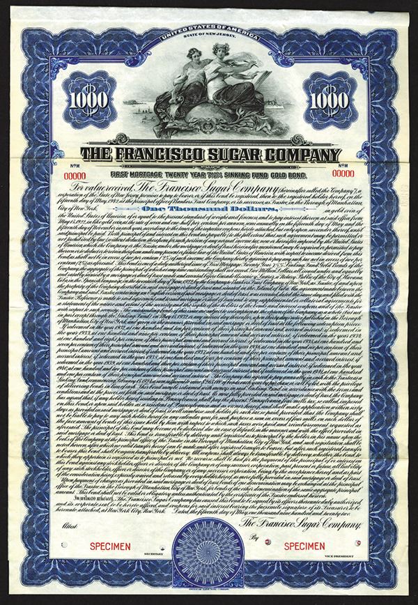 Cuba, 1922, $1000, 7 1/2% 1st Mortgage Twenty Year Sinking Fund Gold Specimen Bond, Coupons attached, Black on blue border and underprint, Two allegorical women sitting atop of globe with lakes in background with ships, Red SPECIMEN overprints POC's and red s/n "00000", VF-XF condition, ABNC.