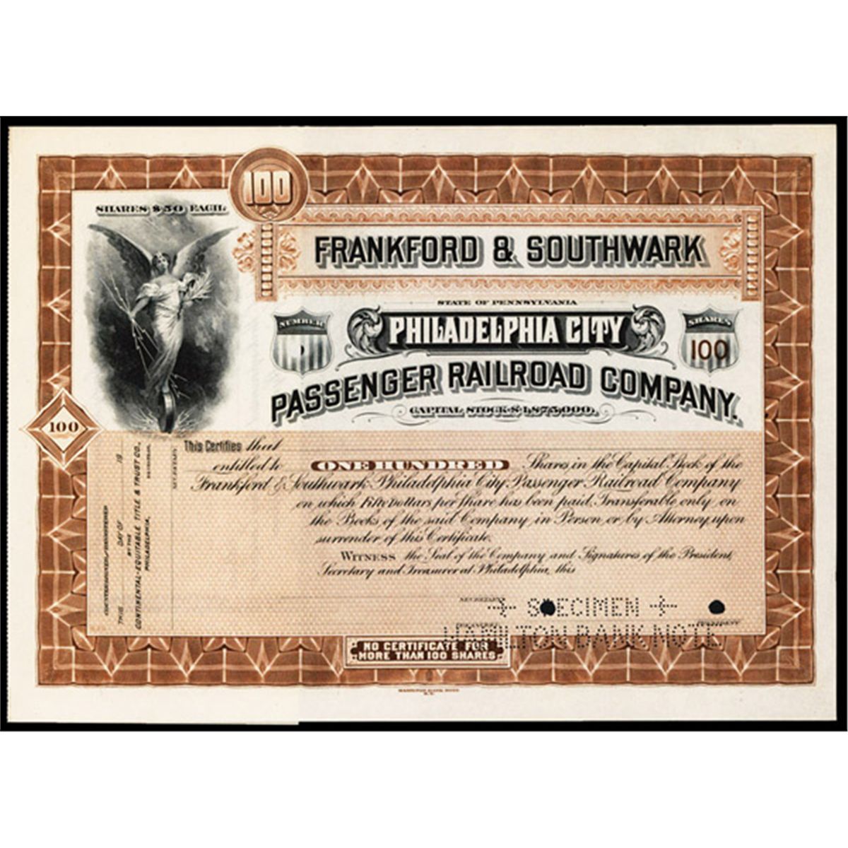 Philadelphia, Pennsylvania, ND (ca. 1890-1900), 100 shs., Specimen Stock certificate, Brown border with Allegorical angel on railroad wheel on left Ornate title, Frankford & Southwark Philadelphia City Passenger Railroad Co., Pin punch specimen, POC's, HBNC., XF to Uncirculated condition.