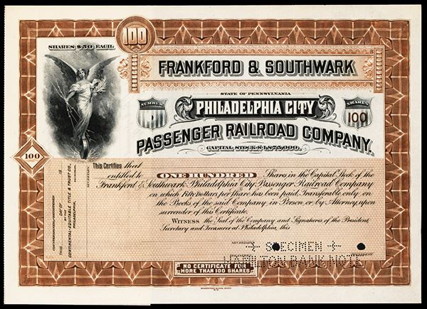 Philadelphia, Pennsylvania, ND (ca. 1890-1900), 100 shs., Specimen Stock certificate, Brown border with Allegorical angel on railroad wheel on left Ornate title, Frankford & Southwark Philadelphia City Passenger Railroad Co., Pin punch specimen, POC's, HBNC., XF to Uncirculated condition.