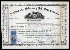 Pennsylvania. 1872. Issued and ink cancelled. 439 Shares, #122, Black, Arms of Pennsylvania, Revenue Stamp attached. Fine to VF. Rare railroad with only 2 certificates reported in Cox (this would be #3).