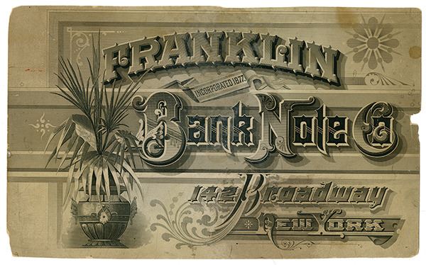 New York, NY. ND (Ca.1870-80's), 12 x 7.5 inches. Black on light beige paper, Ornate sign, some staining and rough edges with chips out of the right. Rare and attractive Security Printer sign. Franklin BNC.
