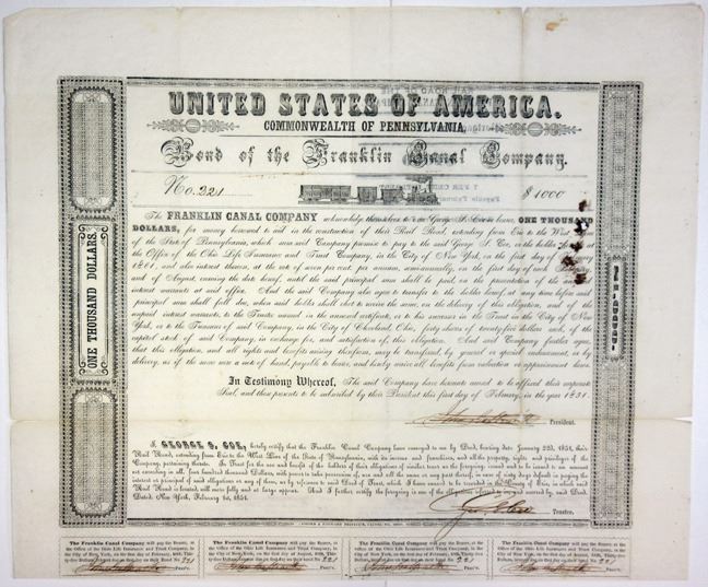 Pennsylvania. $1,000 I/C 7% Coupon Bond, Black print on black border with small locomotive in profile below company title, S/N 221, Fine-VF condition with small ink burn holes at right side margin. Rare and early Pennsylvania canal bond and railroad predecessor bond.