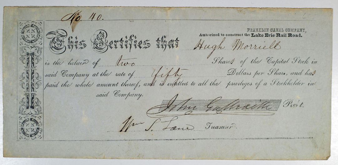 Ohio, ND (1840-1850s). 2 Shares I/U Capital stock Certificate, LAK-135-S-50, S/N 40, provides authorization to construct the Lake Erie Rail Road. Black text. VF condition with toning. Rare.