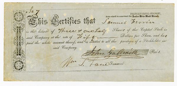 Pennsylvania... 3 1/2 Shares at $50 per share, Issued Capital Stock Certificate, Black print on simple black border printed on blue check sized certificate with light toning, Low serial number #7, Fine-VF condition with staining and toning. Rare early railroad and canal company stock certificate