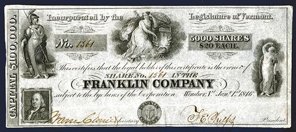 Windsor, Vermont, 1846, 1 Share. Issued and uncancelled stock certificate. Black with no undertint. Vignettes include Franklin on lower left; Allegorical woman warrior on upper left; patriotic allegorical woman with cornucopia and shield with U.S. flag in middle and standing topless justice on right. Company seal on bottom. VF condition. Incorporated in Vermont. Rare and early Vermont company, RWH, NY was the printer. Rare and attractive certificate.