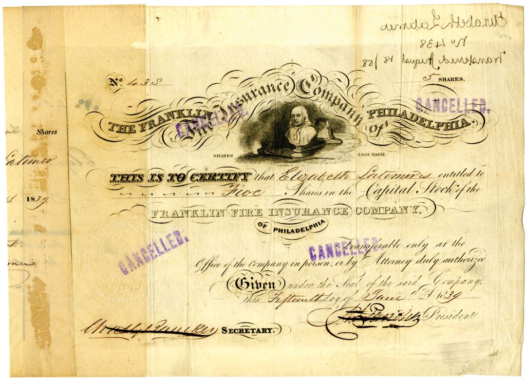 Pennsylvania, 1839. 5 Shares I/C Capital Stock Certificate, S/N 435, Black text, Bust of Ben Franklin at top center. Signatures have been crossed-out, also with purple cancelled stamps. Fine condition with some glue staining at left. The Franklin Fire Insurance Company was chartered in 1829. Franklin Fire specialized in perpetual insurance, as opposed to the earlier "seven-year" polices, and thus the duration of the policy was without limit except by cancellation. Policies were paid for only once, and these deposits were based on the face value of the policy.