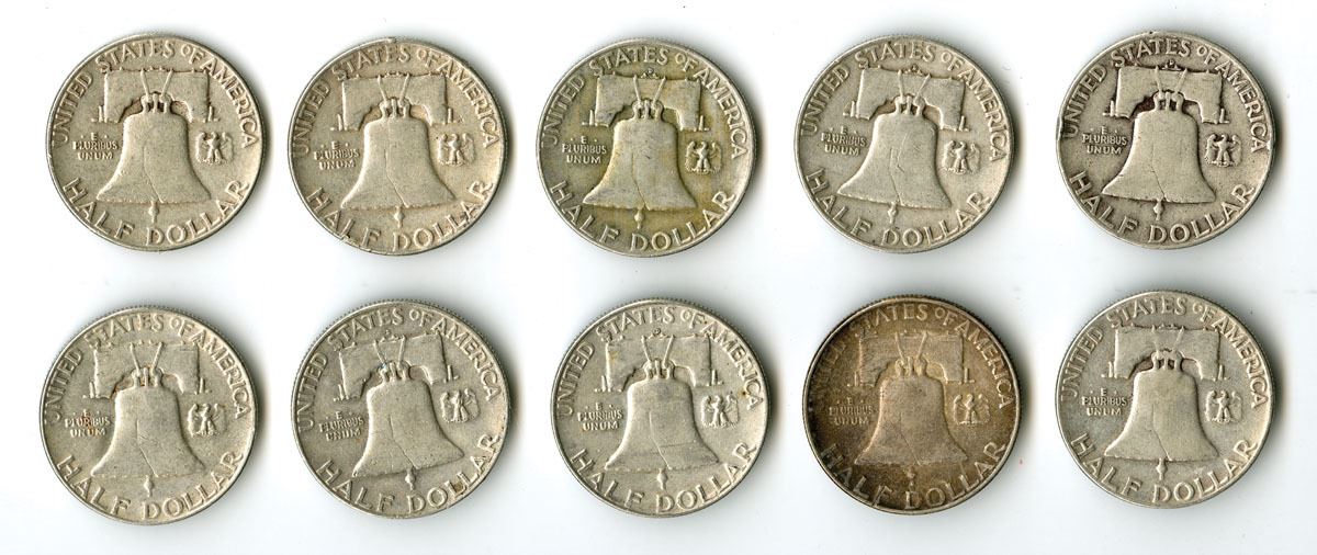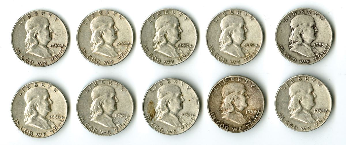 Washington D.C., 1953-56. Lot of 10 Circulated Half Dollars, Includes: 1954-P (4), 1956-P, 1953-D (3), 1954-D (2). VF to VF+ condition. (10 Coins, $5 Face of 90% Silver, 3.617 ounces of .999 Silver).