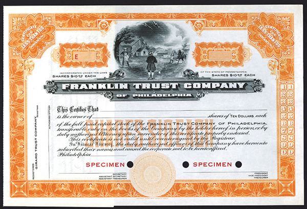 Pennsylvania. <100 Shares Specimen Stock Certificate. Black print with an orange border and under print. Vignette of Benjamin Franklin harnessing electricity from lightning. Red SPECIMEN overprints, POC's, VF-XF, SBNC.