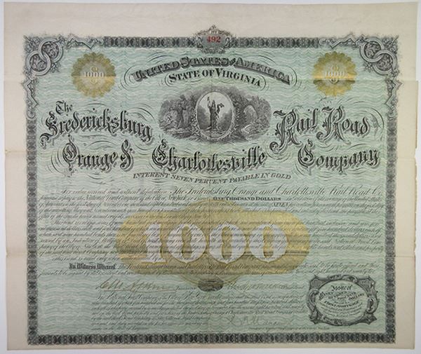 Virginia, 1872, $1000, I/U, 7% Gold Coupon Bond, Black on light green and metallic gold underprint, surveyor and Natural Bridge behind VA state seal over ornate title, S/N 492, all coupons present, extremely attractive bond from a new estate find.