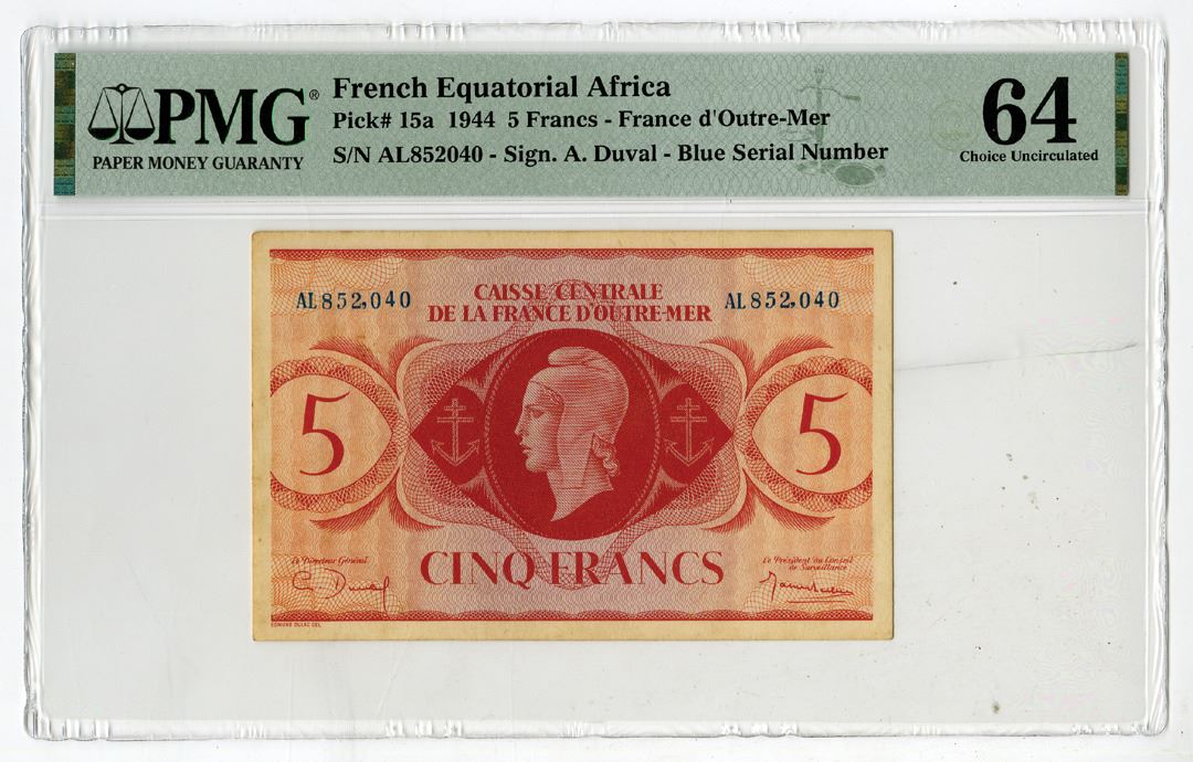 French Equatorial Africa, 1944, 5 Francs, P-15a, Issued banknote, Red on pink, Blue serial #s AL 852,040, Signature: A. Duval, PMG graded Choice Uncirculated 64.