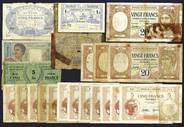 French Guiana. 5 Francs. SCWPM 1 Both as short snorters, one Identified to Camp Rochambeau. New Caledonia. 1, 5, 20, Francs. SCWPM 36a, b (12); 37a (2), b (2); 50b, 55a. New Hebrides. 5 Francs. SCWPM 1 as a short snorter, right end missing. Mostly Fair-Good, some with paper loss. 21 pieces.