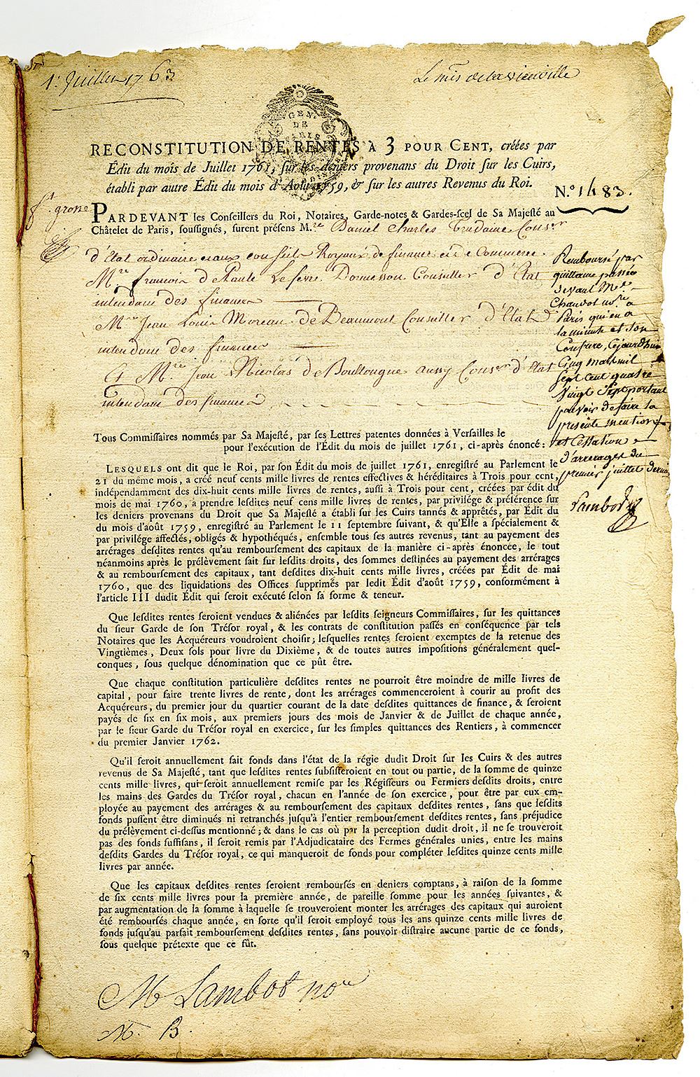 France, 1761. Outer cover is printed in paper. Interior is the agreement printed on vellum. Multiple-page document in French regarding the payment of hereditary annuities granted by the French King Louis XVI and Parliament, which goes over terms and policies in great detail. Louis XVI was the last king of France before the fall of the monarchy during the French Revolution. He was referred to as Citizen Louis Capet during the four months just before he was executed by guillotine. Also mentioned in the text is Joseph Micault d'Harvelay, who was a Royal Treasury Guard and State Councilor at the time of the document. The subject of the document seems to be Marquis Etienne Auguste Baude, who was also a knight in the Royal Army. Fascinating financial piece of pre-Revolutionary France history, unique and rare.