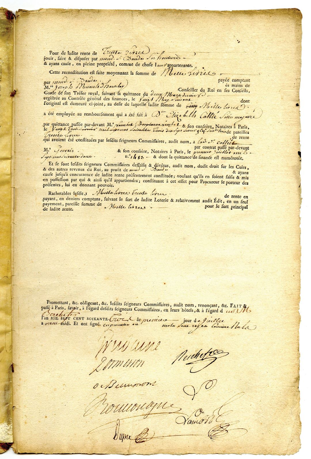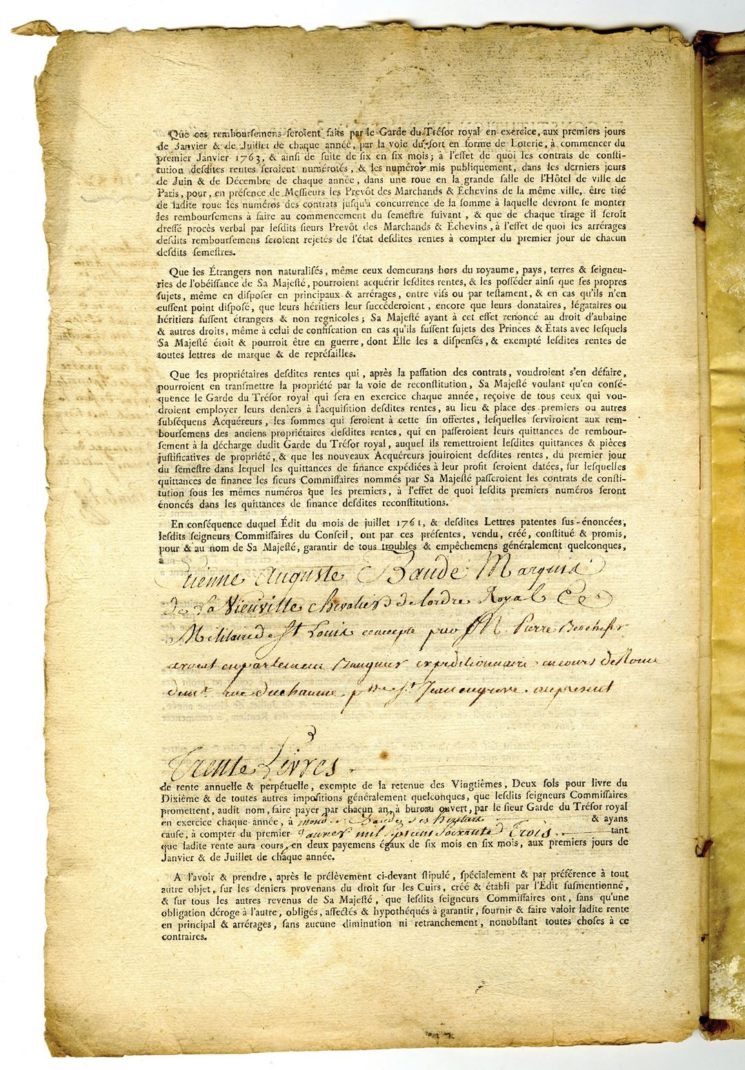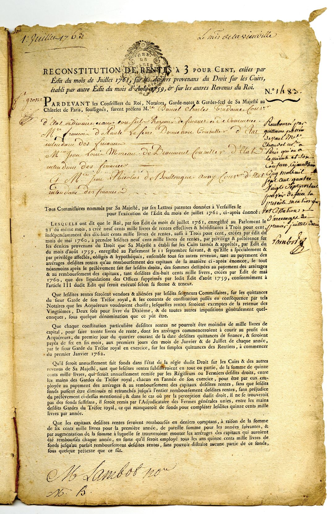 France, 1761. Outer cover is printed in paper. Interior is the agreement printed on vellum. Multiple-page document in French regarding the payment of hereditary annuities granted by the French King Louis XVI and Parliament, which goes over terms and policies in great detail. Louis XVI was the last king of France before the fall of the monarchy during the French Revolution. He was referred to as Citizen Louis Capet during the four months just before he was executed by guillotine. Also mentioned in the text is Joseph Micault d'Harvelay, who was a Royal Treasury Guard and State Councilor at the time of the document. The subject of the document seems to be Marquis Etienne Auguste Baude, who was also a Knight in the Royal Army. Fascinating financial piece of pre-Revolutionary France history, unique and rare.