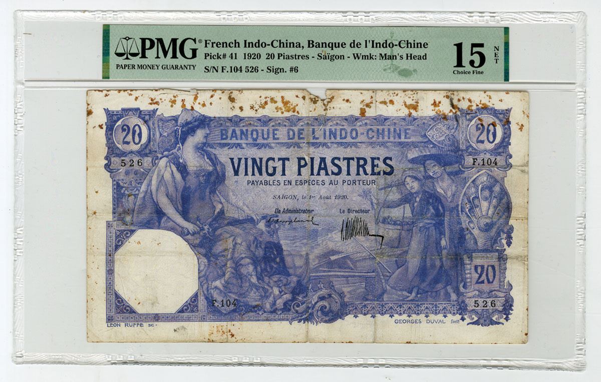 French Indo-China, 1920. 20 Piastres, P-41, Issued Banknote, Violet printing with seated woman with sword at left and market scene at right, Back is black and purple, S/N F.104 526, PMG graded Choice Fine 15 NET with comments "Rust, Large Tear, Minor Repairs."
