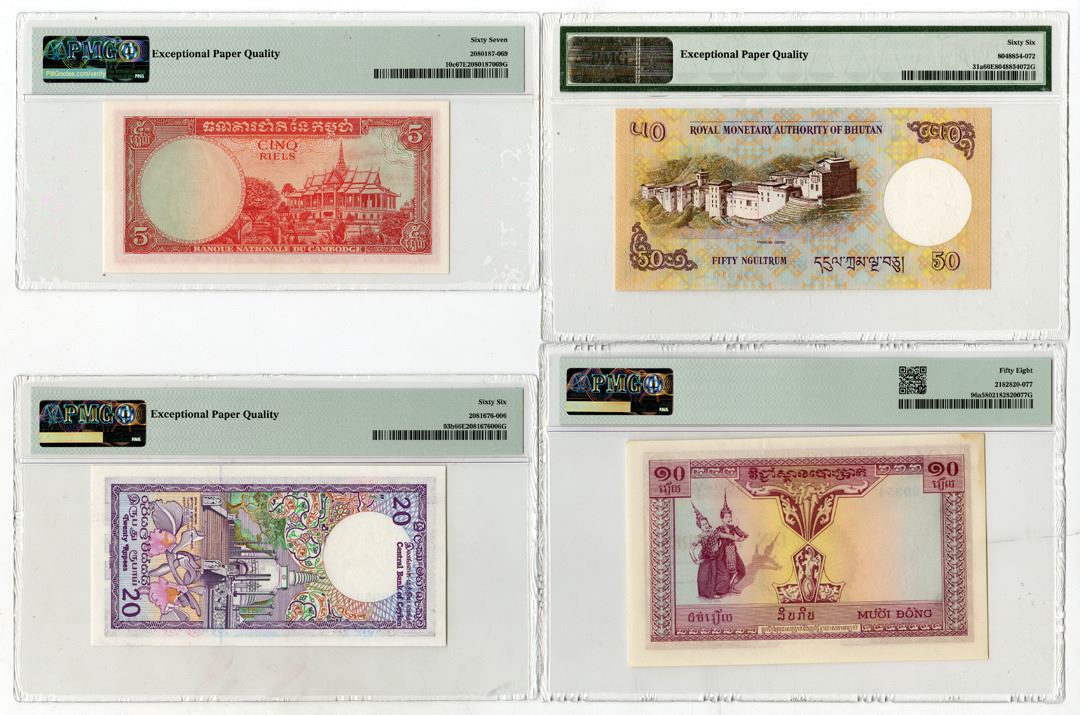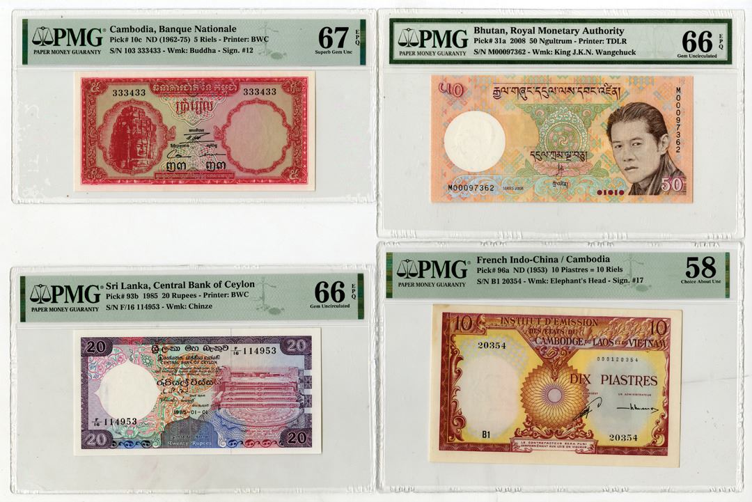 French Indo-China, Cambodia, Sri Lanka, & Bhutan, ND (1953) to 2008. Assortment of Issued Banknotes, Includes: Institu d'Emission des Etats du Cambodge du Laos et du Vietnam, ND (1953), 10 Piastres = 10 Riels, P-96a, S/N B1 20354, PMG graded Choice AU 58; Banque Nationale du Cambodge, ND (1962-75), 5 Riels, P-10c, S/N 103 333433, PMG graded Superb Gem Unc 67 EPQ, BWC; Central Bank of Ceylon, 1985, 20 Rupees, P-93b, S/N F/16 114953, PMG graded Gem Unc 66 EPQ, BWC; Royal Monetary Authority of Bhutan, 2008, 50 Ngultrum, P-31a, S/N M00097362, PMG graded Gem Unc 66 EPQ, TDLR. (4). Sold "AS IS" no returns accepted.